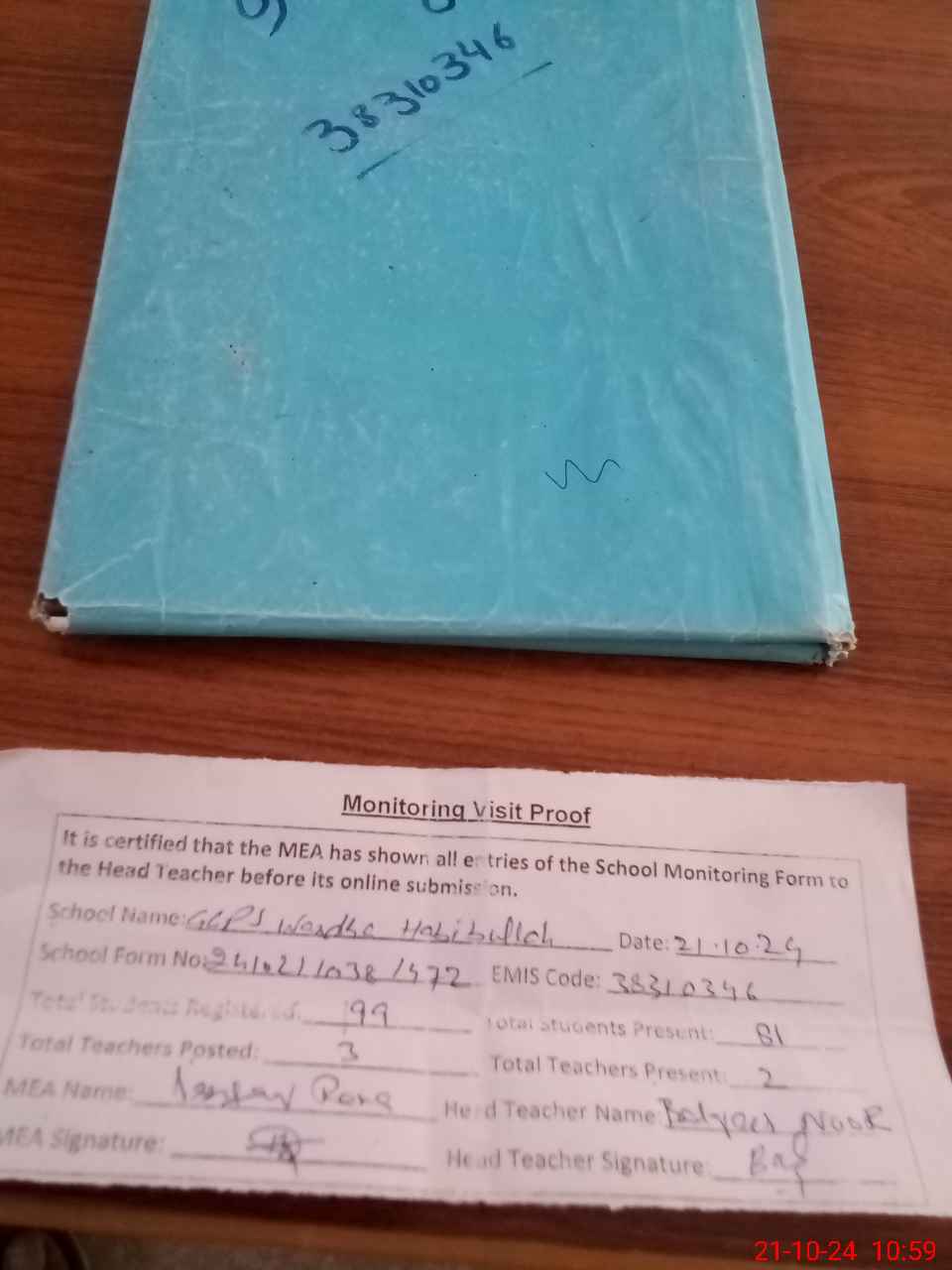 | Certified that this School was Inspected by the Undersigned MEA/DMO Today and the Information Stated Above is as Per Record. | |||||