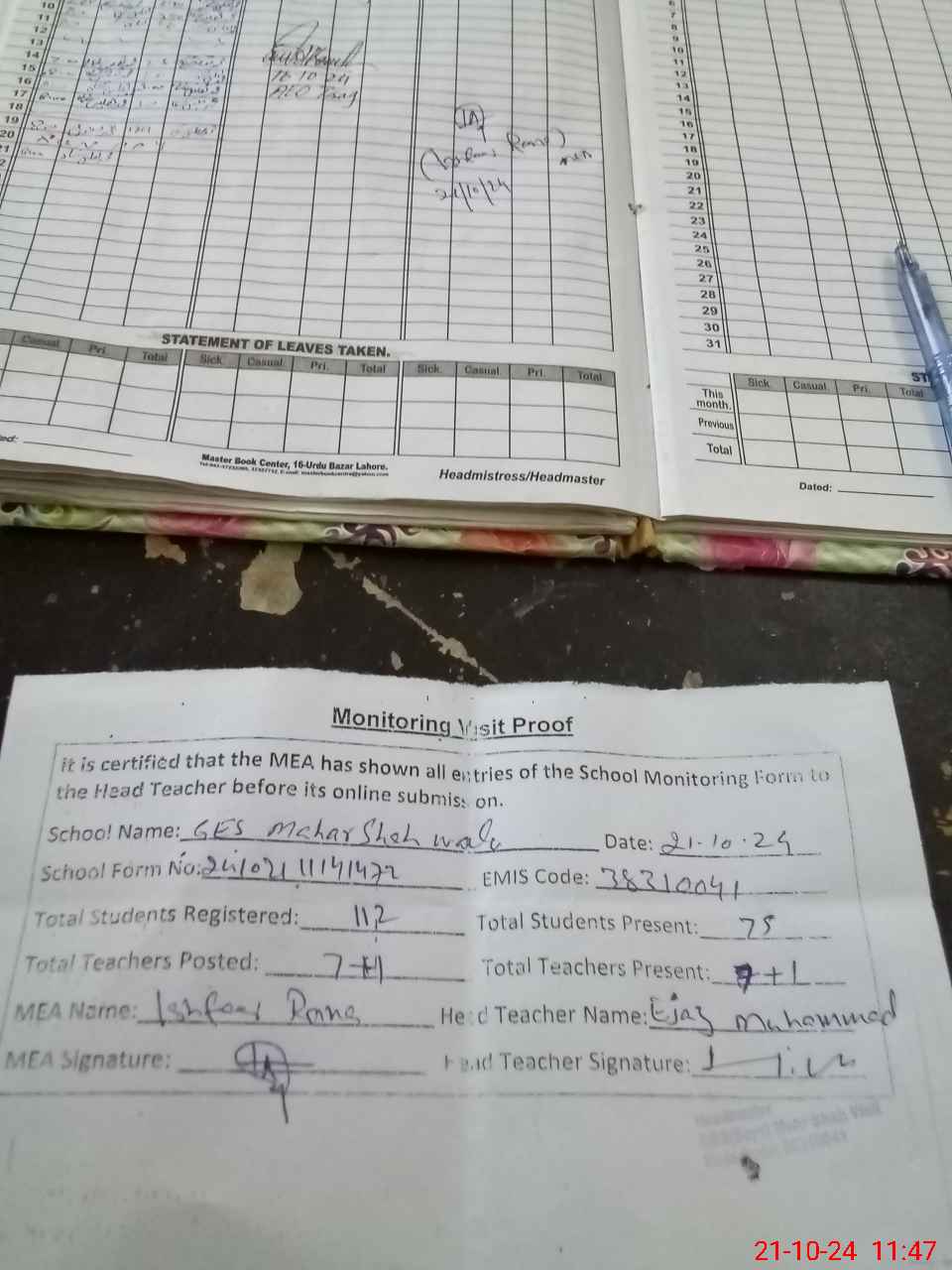 | Attendance Register | Head Teacher | MEA with School | Visit Proof |