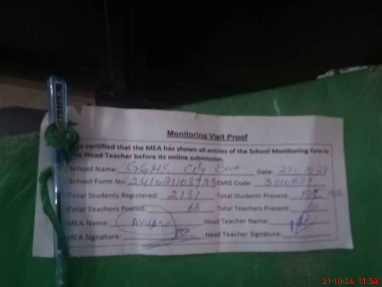 | Attendance Register | Head Teacher | MEA with School | Visit Proof |
