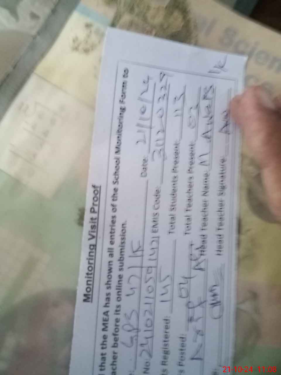 | Attendance Register | Head Teacher | MEA with School | Visit Proof |