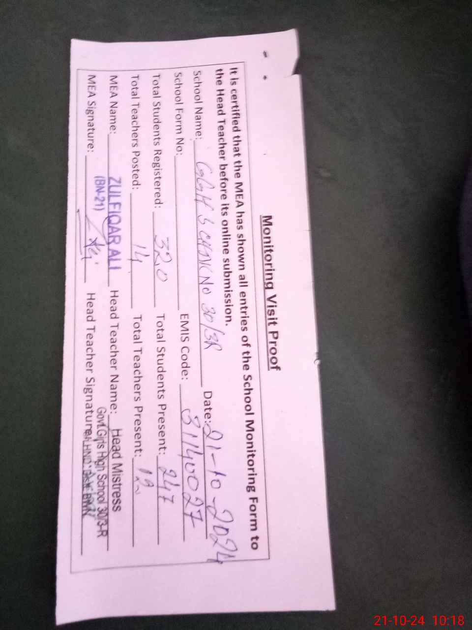 | EMIS Code: 31140027 | Name of School: GGHS CHAK NO.30/3-R | |||