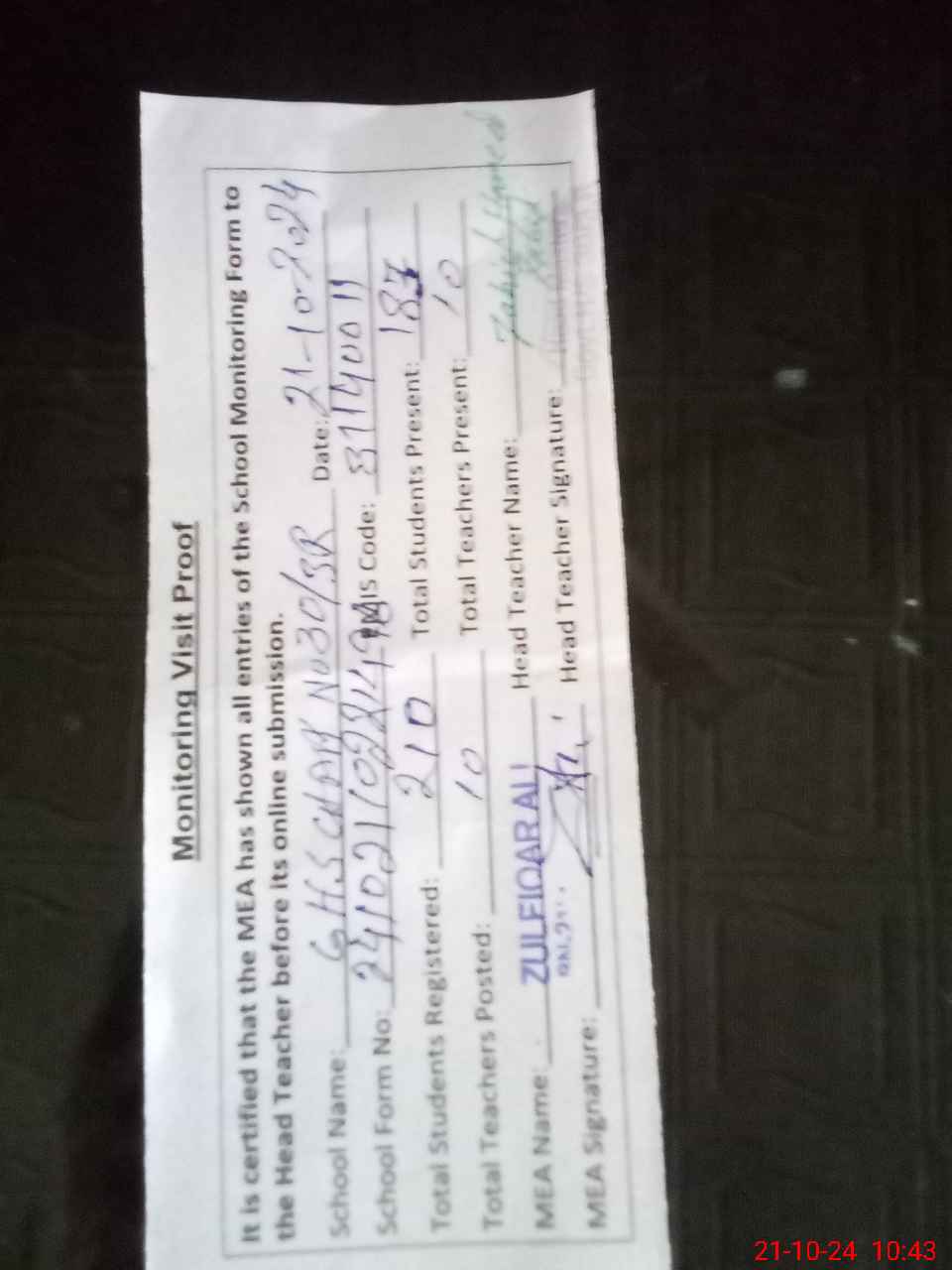 | Attendance Register | Head Teacher | MEA with School | Visit Proof |