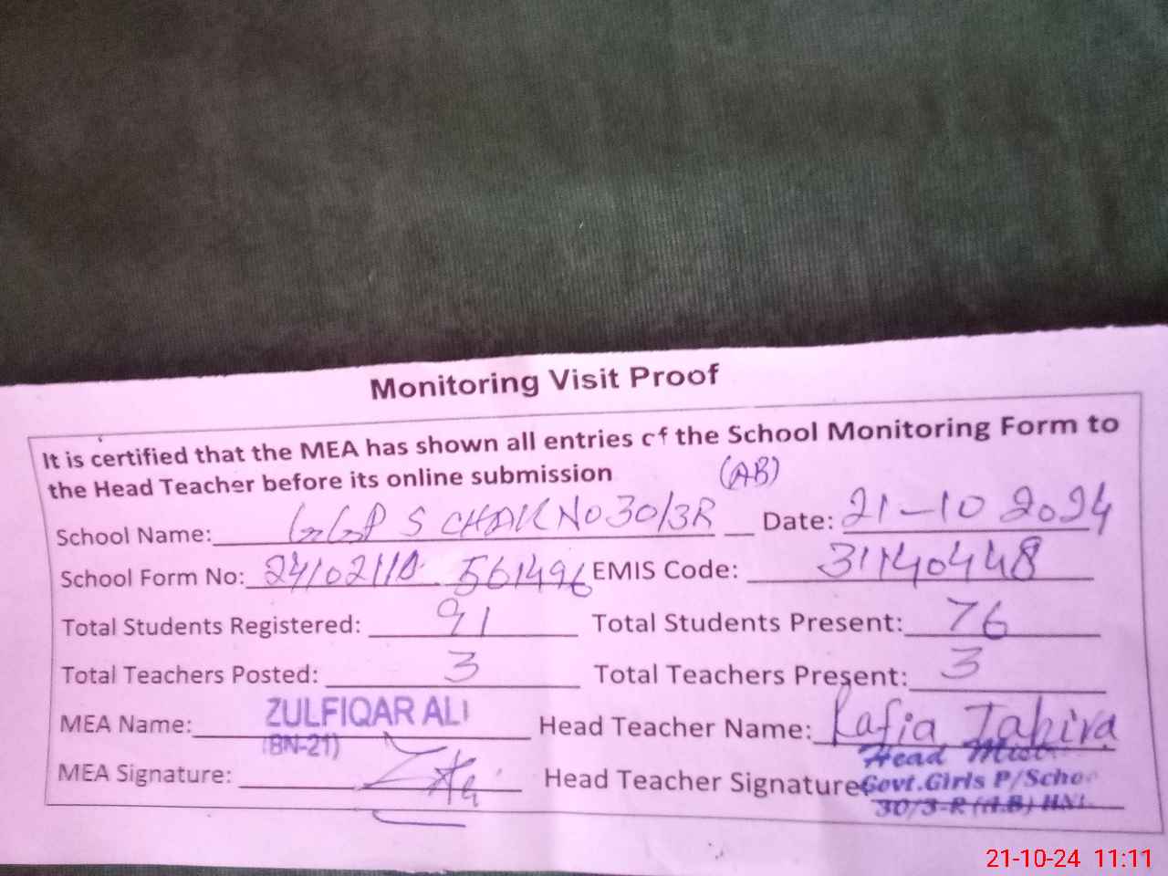 | Monitoring Date: 21-10-2024 | Start Time: 21-10-2024 10:55 AM | End Time: 21-10-2024 11:11 AM | Name of MEA: Zu**** Al**** BN**** | |