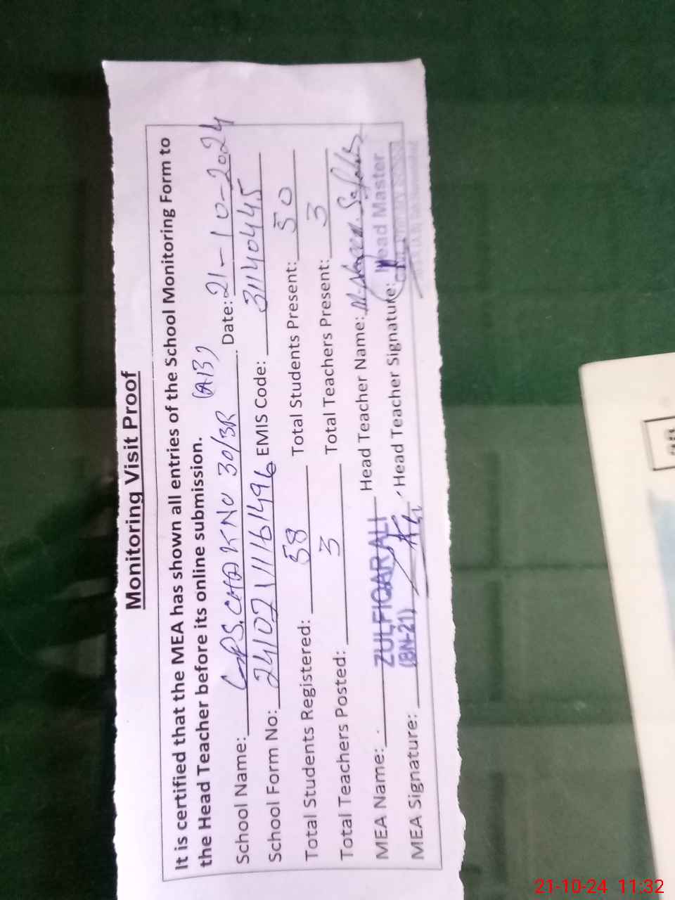 | Attendance Register | Head Teacher | MEA with School | Visit Proof |