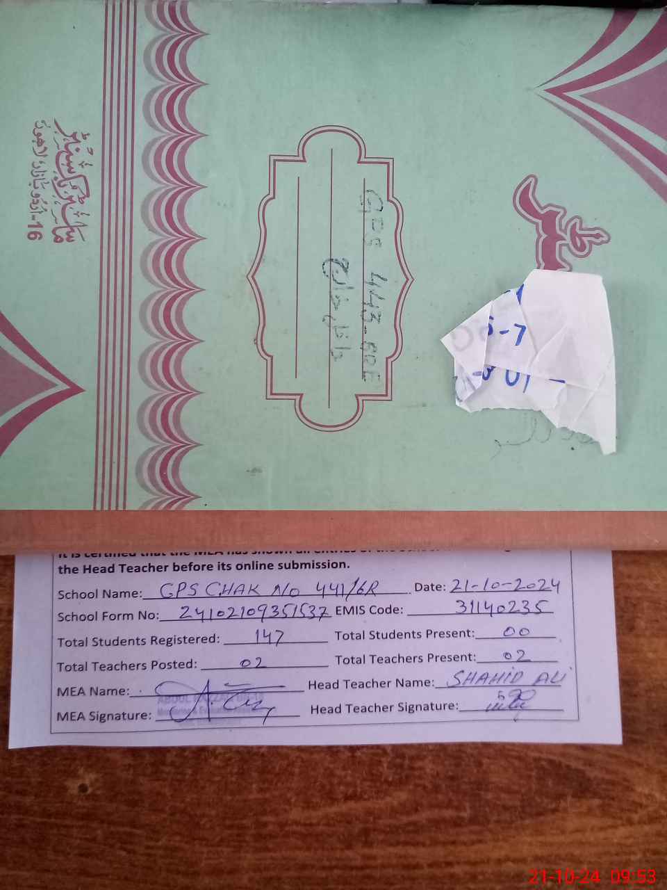| EMIS Code: 31140235 | Name of School: GPS CHAK NO. 441/6-R | |||