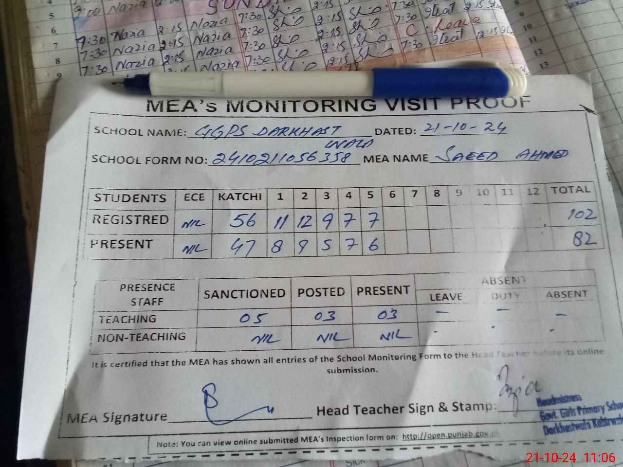| Attendance Register | Head Teacher | MEA with School | Visit Proof |