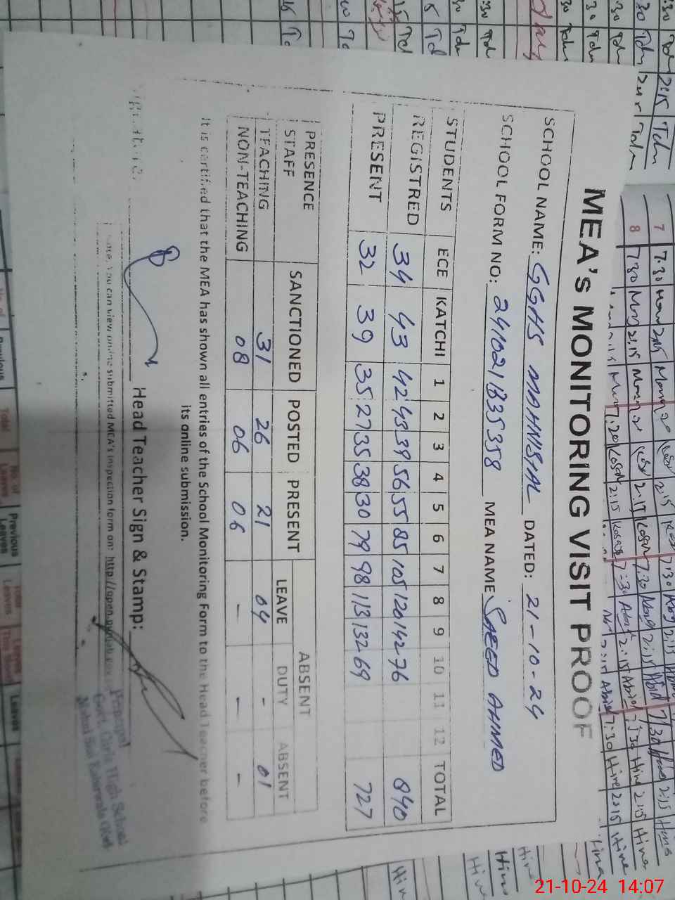 | Certified that this School was Inspected by the Undersigned MEA/DMO Today and the Information Stated Above is as Per Record. | |||||