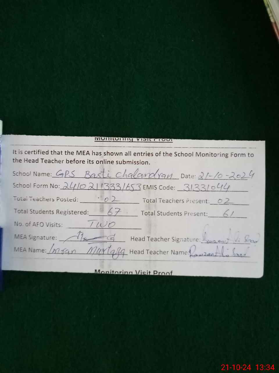 | Attendance Register | Head Teacher | MEA with School | Visit Proof |