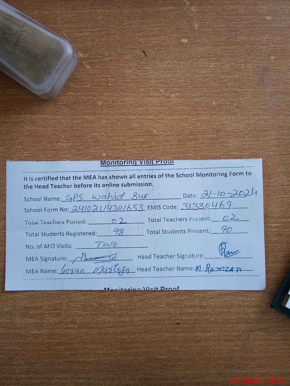 | EMIS Code: 31330469 | Name of School: GPS WAHID BUX | |||