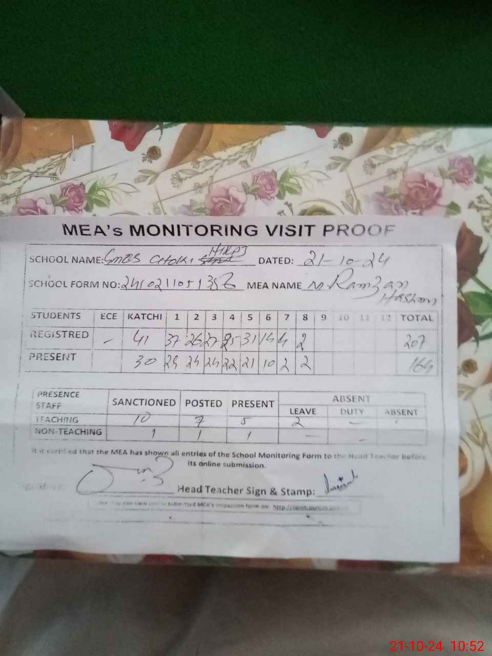 | Attendance Register | Head Teacher | MEA with School | Visit Proof |