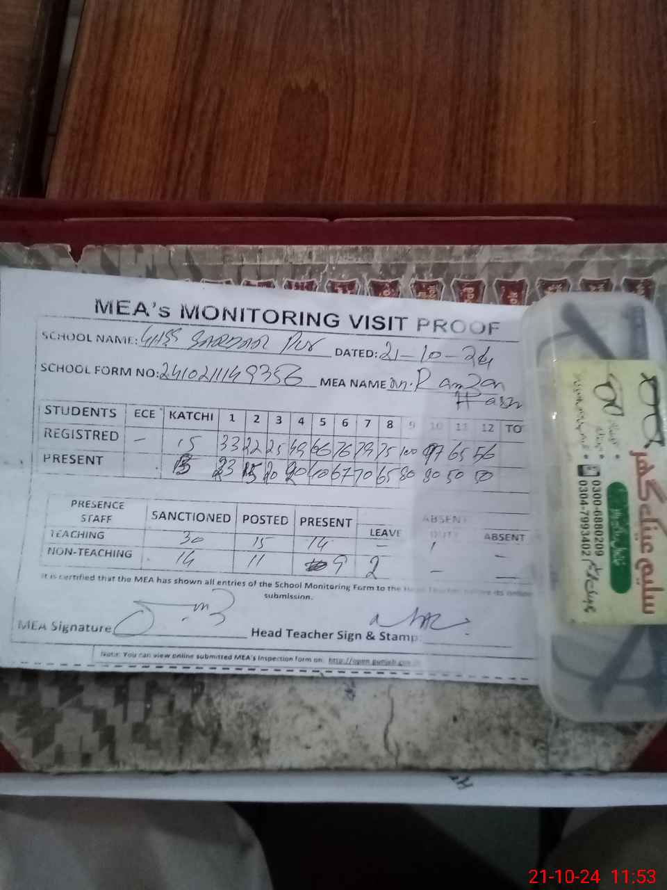 | Attendance Register | Head Teacher | MEA with School | Visit Proof |
