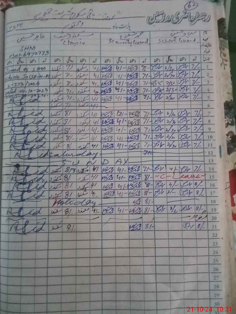 | CNIC | Full Name | Designation | R/C | Absence During Last Calender Month |