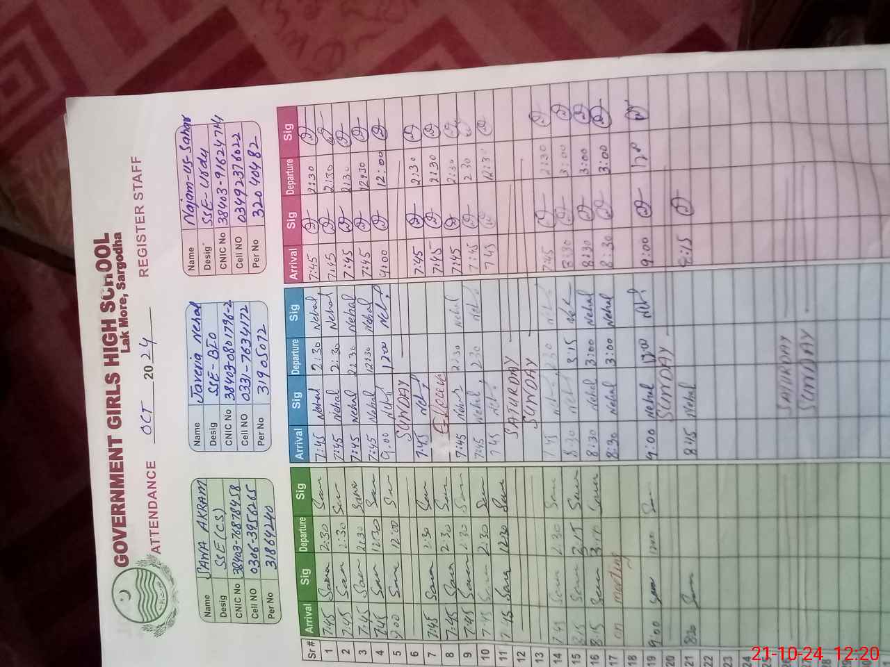 | CNIC | Full Name | Designation | R/C | Absence during last cal. month |