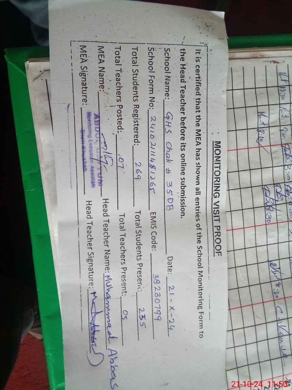 | Certified that this School was Inspected by the Undersigned MEA/DMO Today and the Information Stated Above is as Per Record. | |||||