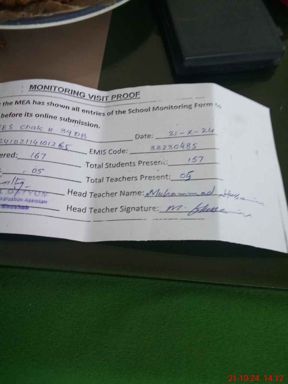 | Attendance Register | Head Teacher | MEA with School | Visit Proof |