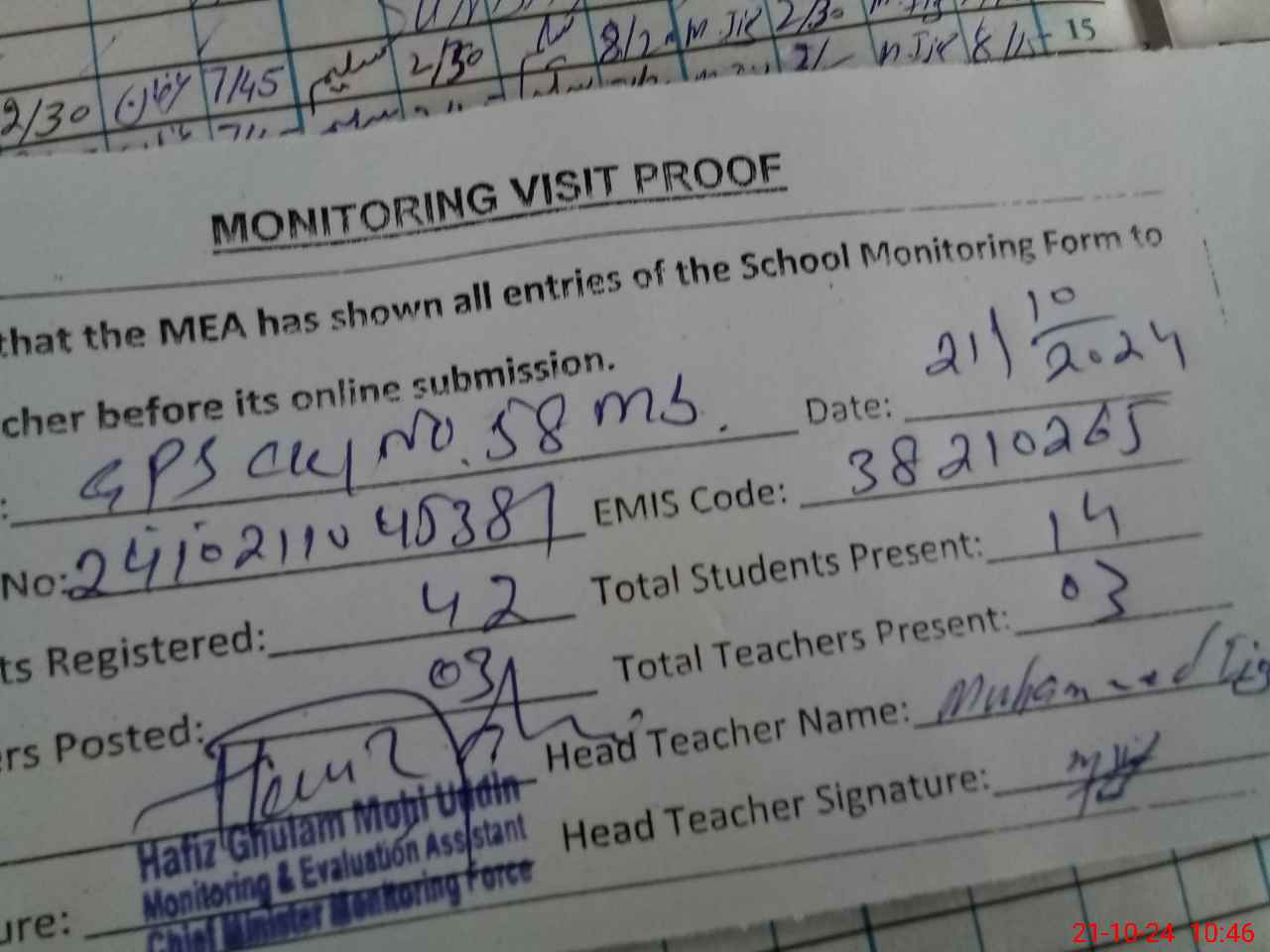 | EMIS Code: 38210265 | Name of School: GPS CHAK NO. 58 MB | |||