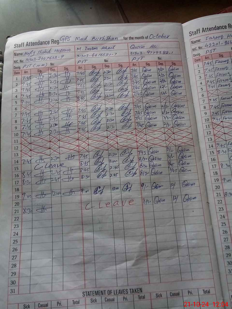 | CNIC | Full Name | Designation | R/C | Absence during last cal. month |