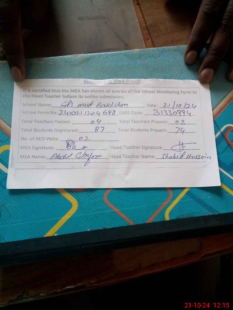 | EMIS Code: 31330994 | Name of School: GPS MUD BUKHSHAN | |||