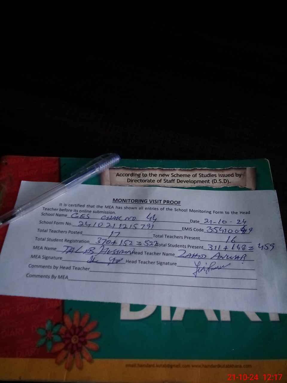 | Attendance Register | Head Teacher | MEA with School | Visit Proof |