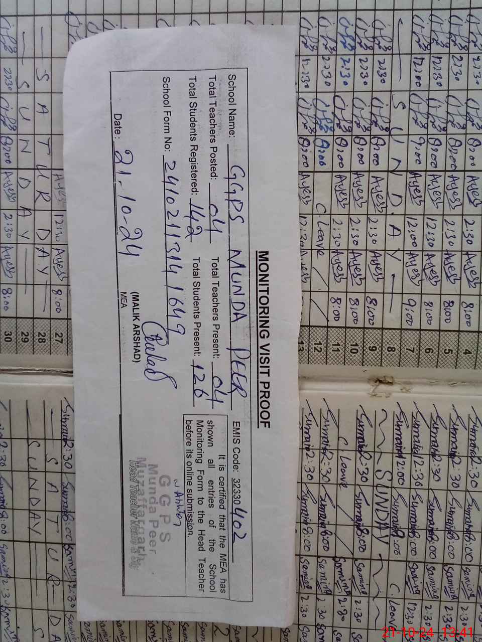 | Attendance Register | Head Teacher | MEA with School | Visit Proof |