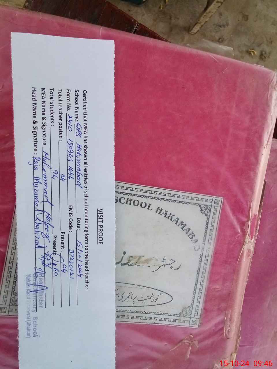 | Total no. of Classrooms: 5 No. of Classrooms Used for Teaching: 5 No. of Classrooms Storing Old Furniture, FTBs, etc: 0Comments if Any: Sir GPS Hakim Abad 37220121 PST teacher Bilal was died on 12 Jan 2024 but his name is running in teacher list to date 15 October 2024 Please update teacher list on MEA Tab List of students given on MEA Tab but students are promoted next classes and som |