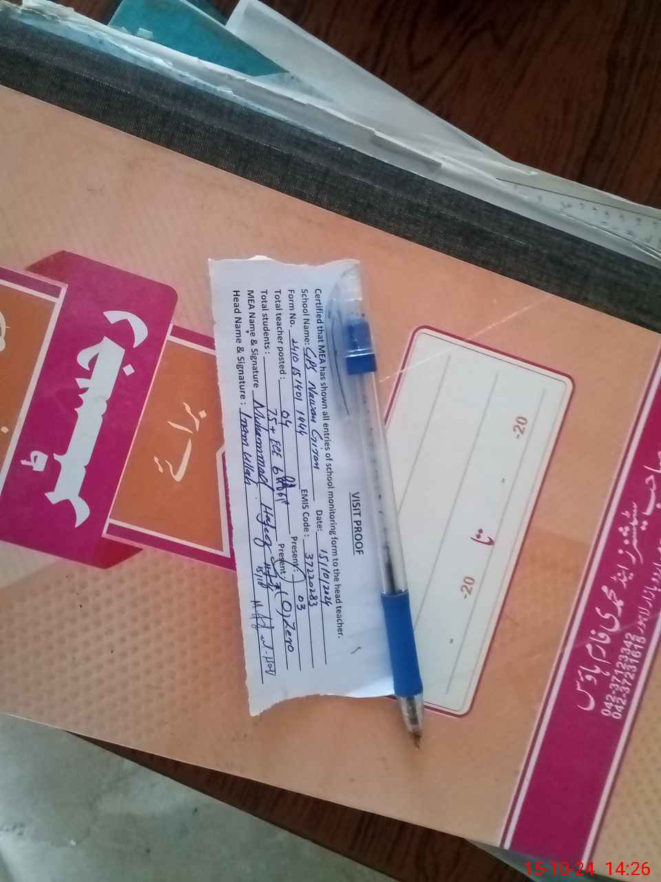| Remarks (Use Separate Page if Required): Sir GPS Nawan Giran 37220283 When I reached schedule visit in above mentioned school at 1401 hrs teacher already signed teacher attendance register all teachers with Head Teacher PST Inam ullah for leave one teacher PST teacher Muhammad Akram was not present in school he reached school at 1432 hrs Teacher are present in school but students presence are Zero According Head Teacher we are on protest Please check and instruct strictly | |||||