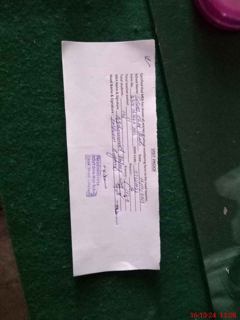 | Attendance Register | Head Teacher | MEA with School | Visit Proof |