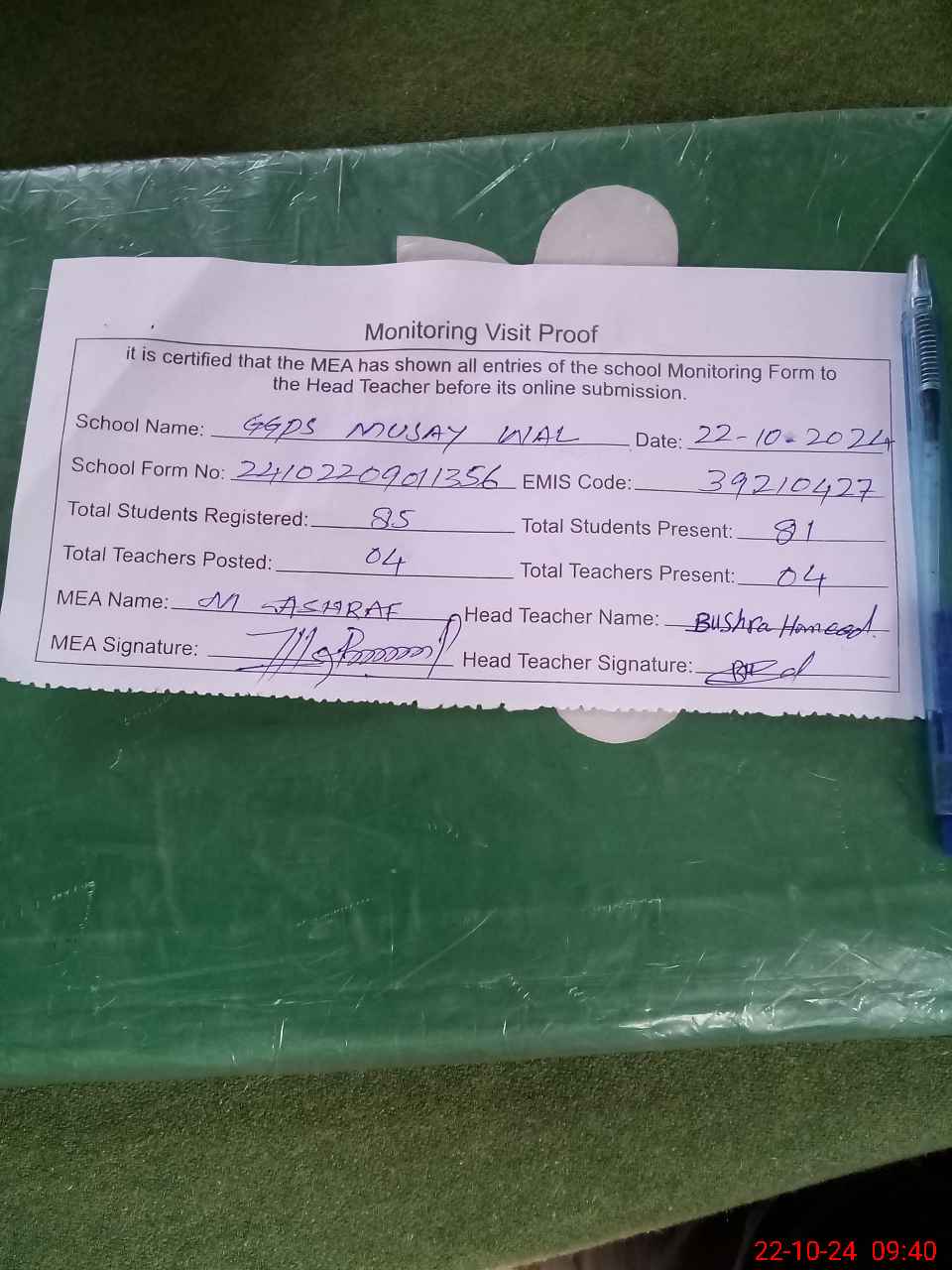 | Certified that this School was Inspected by the Undersigned MEA/DMO Today and the Information Stated Above is as Per Record. | |||||
