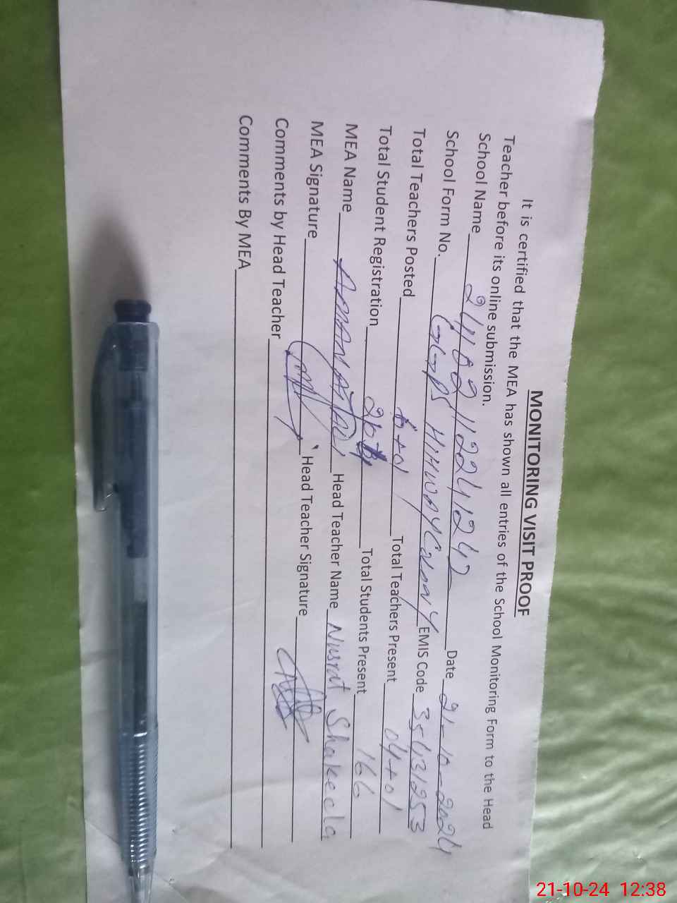 | Attendance Register | Head Teacher | MEA with School | Visit Proof |