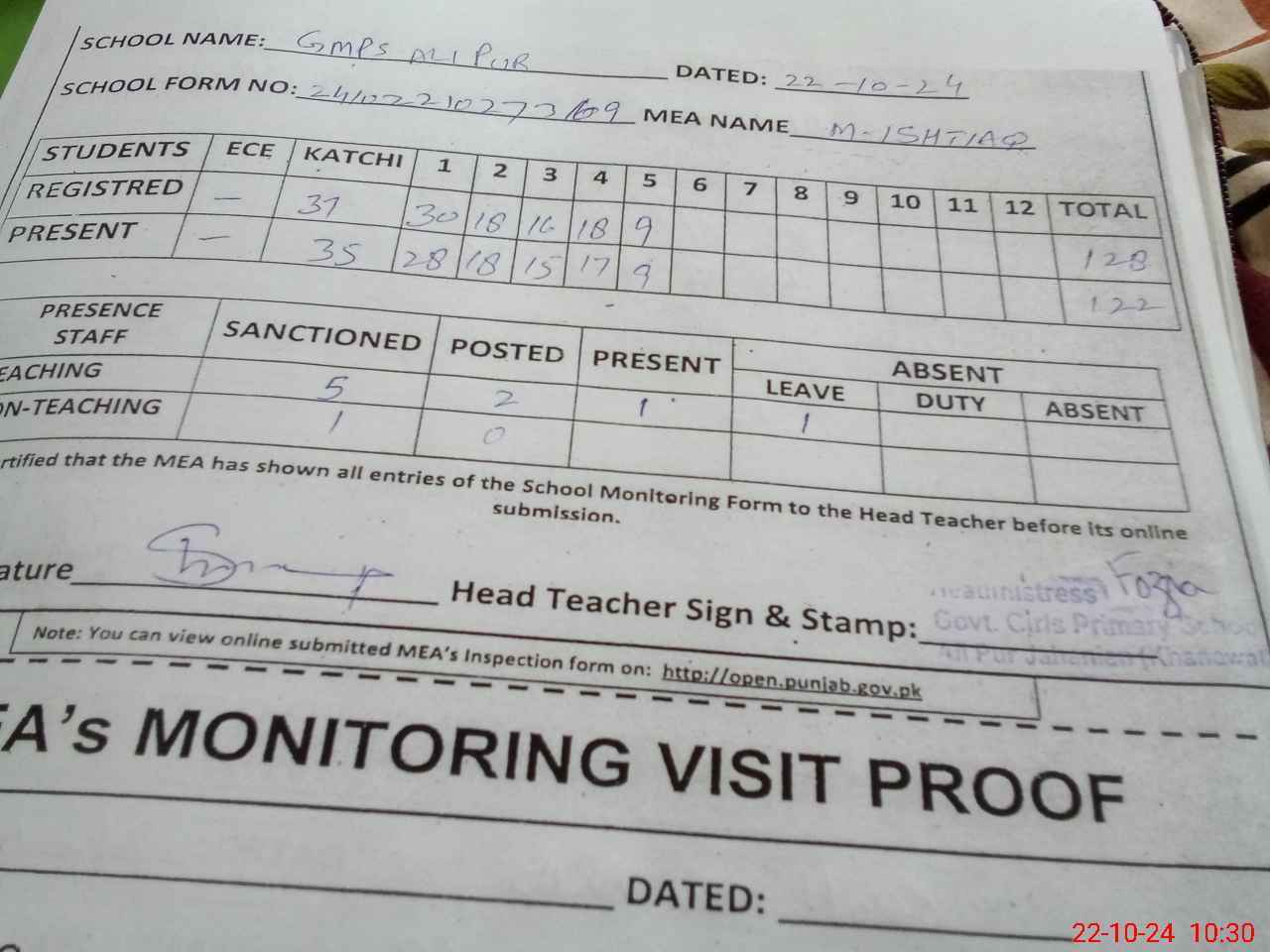 | Attendance Register | Head Teacher | MEA with School | Visit Proof |