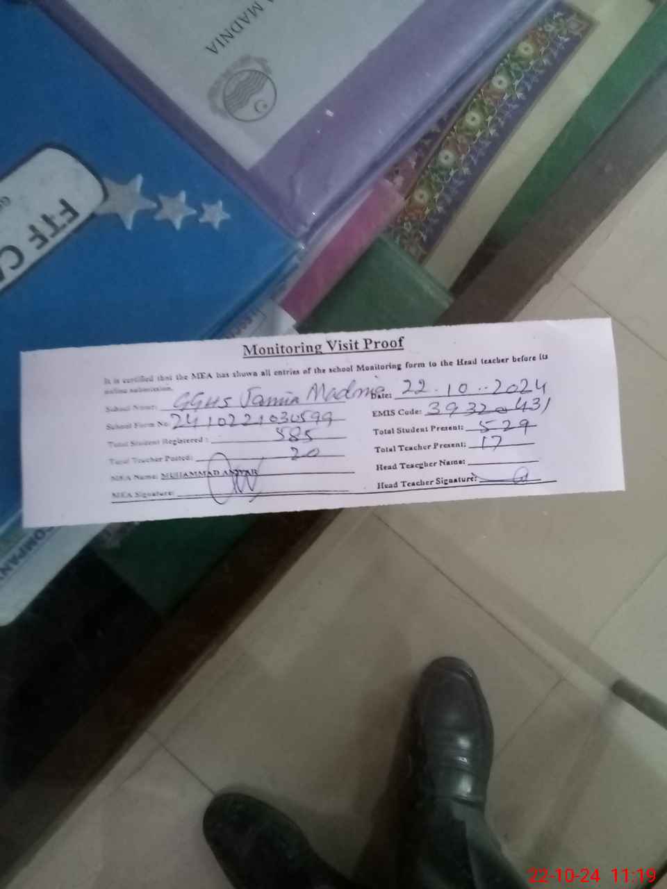 | Attendance Register | Head Teacher | MEA with School | Visit Proof |