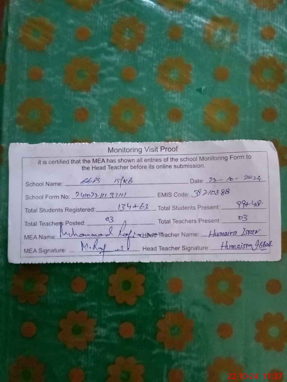 | Certified that this School was Inspected by the Undersigned MEA/DMO Today and the Information Stated Above is as Per Record. | |||||