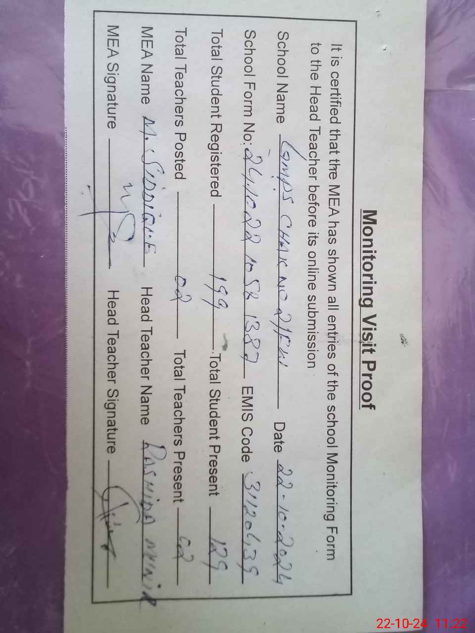 | Attendance Register | Head Teacher | MEA with School | Visit Proof |