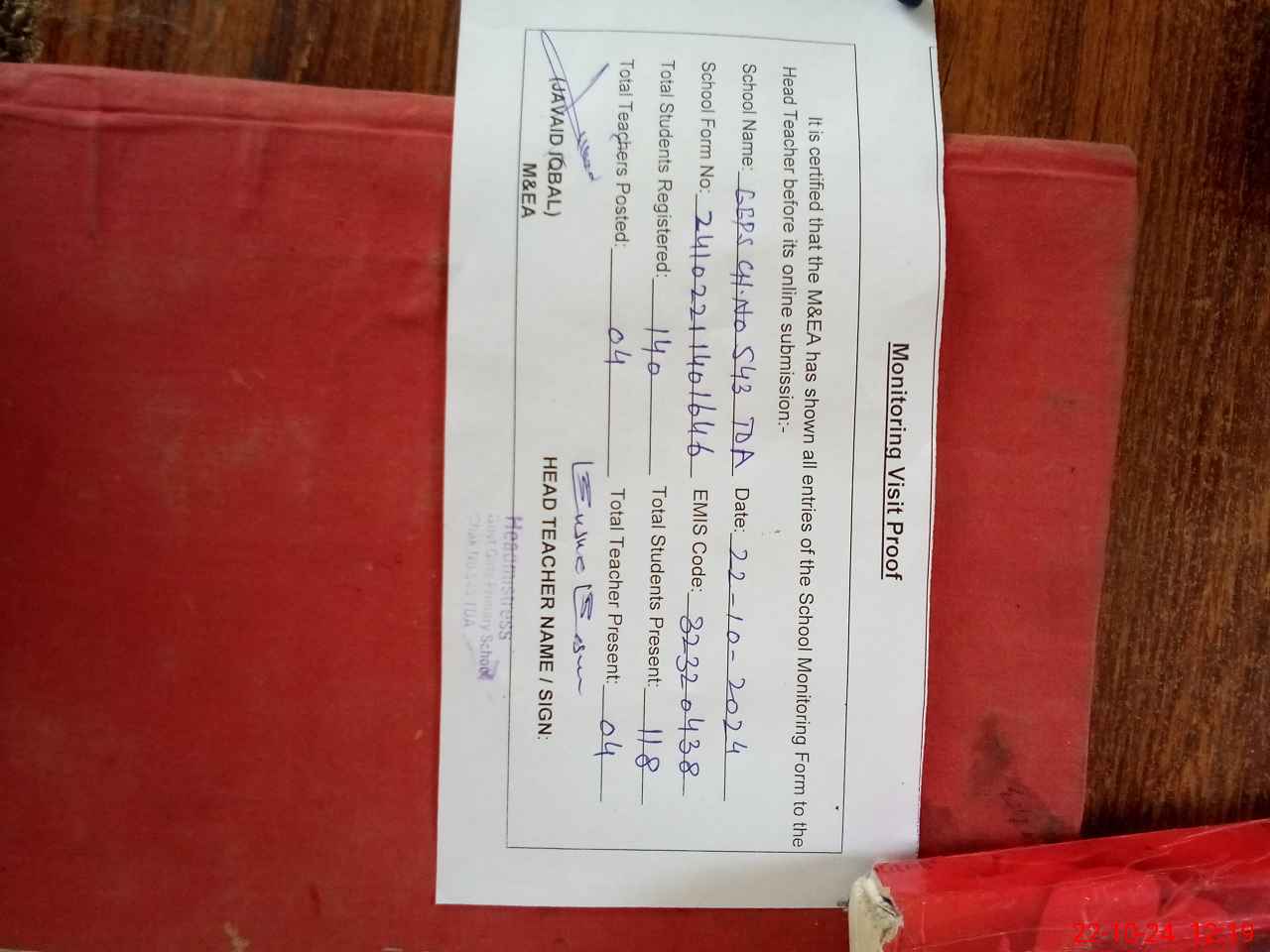 | Attendance Register | Head Teacher | MEA with School | Visit Proof |