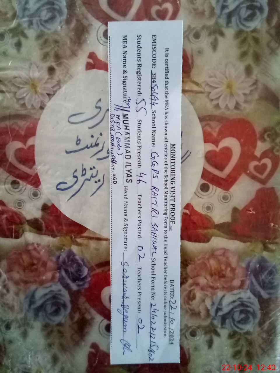 | Certified that this School was Inspected by the Undersigned MEA/DMO Today and the Information Stated Above is as Per Record. | |||||