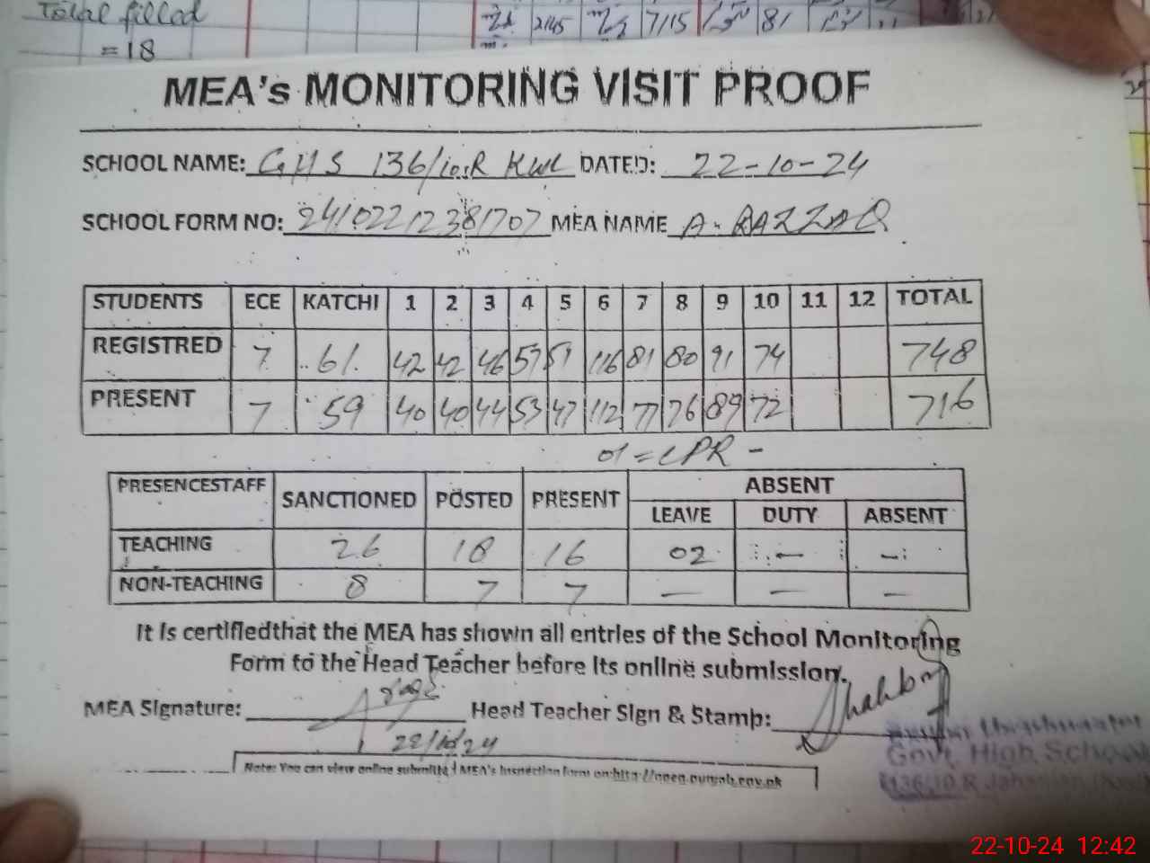 | Attendance Register | Head Teacher | MEA with School | Visit Proof |