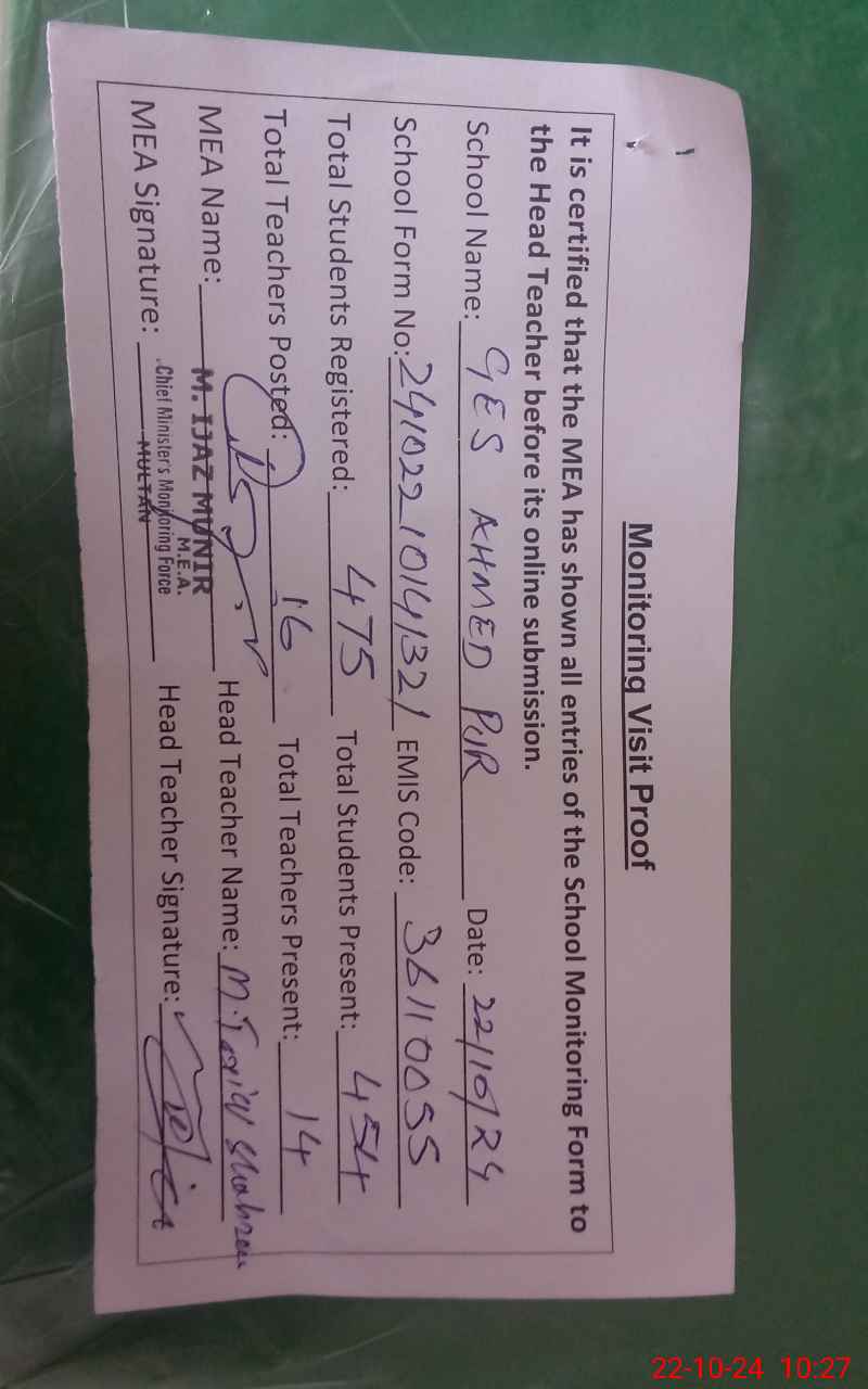 | Certified that this School was Inspected by the Undersigned MEA/DMO Today and the Information Stated Above is as Per Record. | |||||
