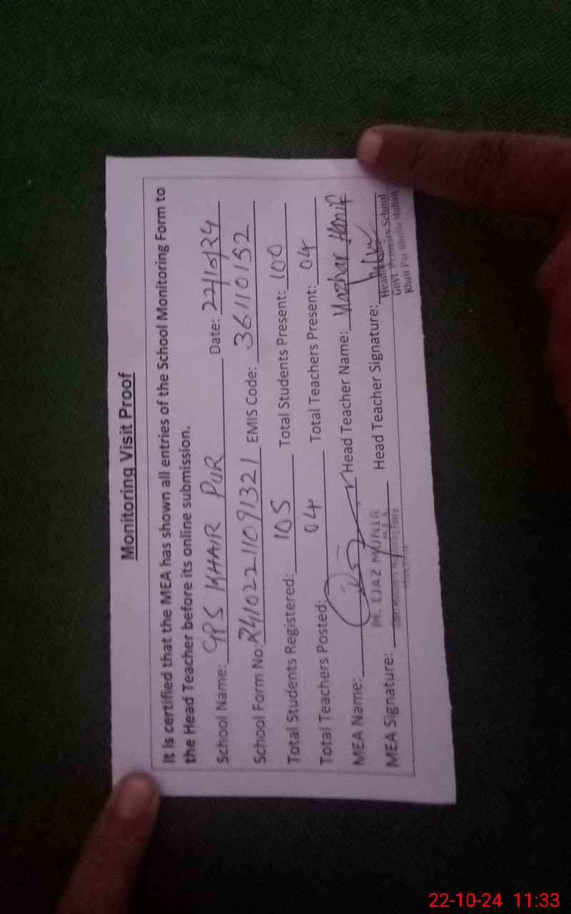 | EMIS Code: 36110152 | Name of School: GPS KHAIR PUR BHUTTA CANTT P/O QASIM BELLA | |||