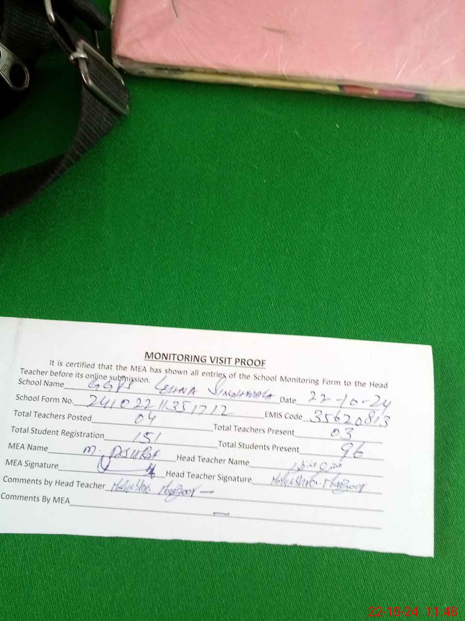 | Attendance Register | Head Teacher | MEA with School | Visit Proof |