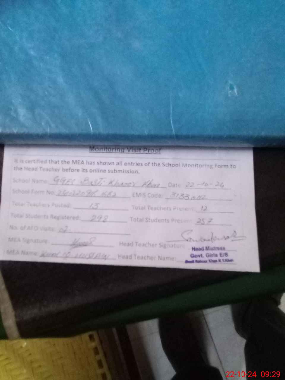 | Attendance Register | Head Teacher | MEA with School | Visit Proof |