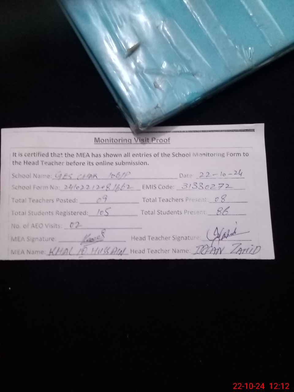| Attendance Register | Head Teacher | MEA with School | Visit Proof |