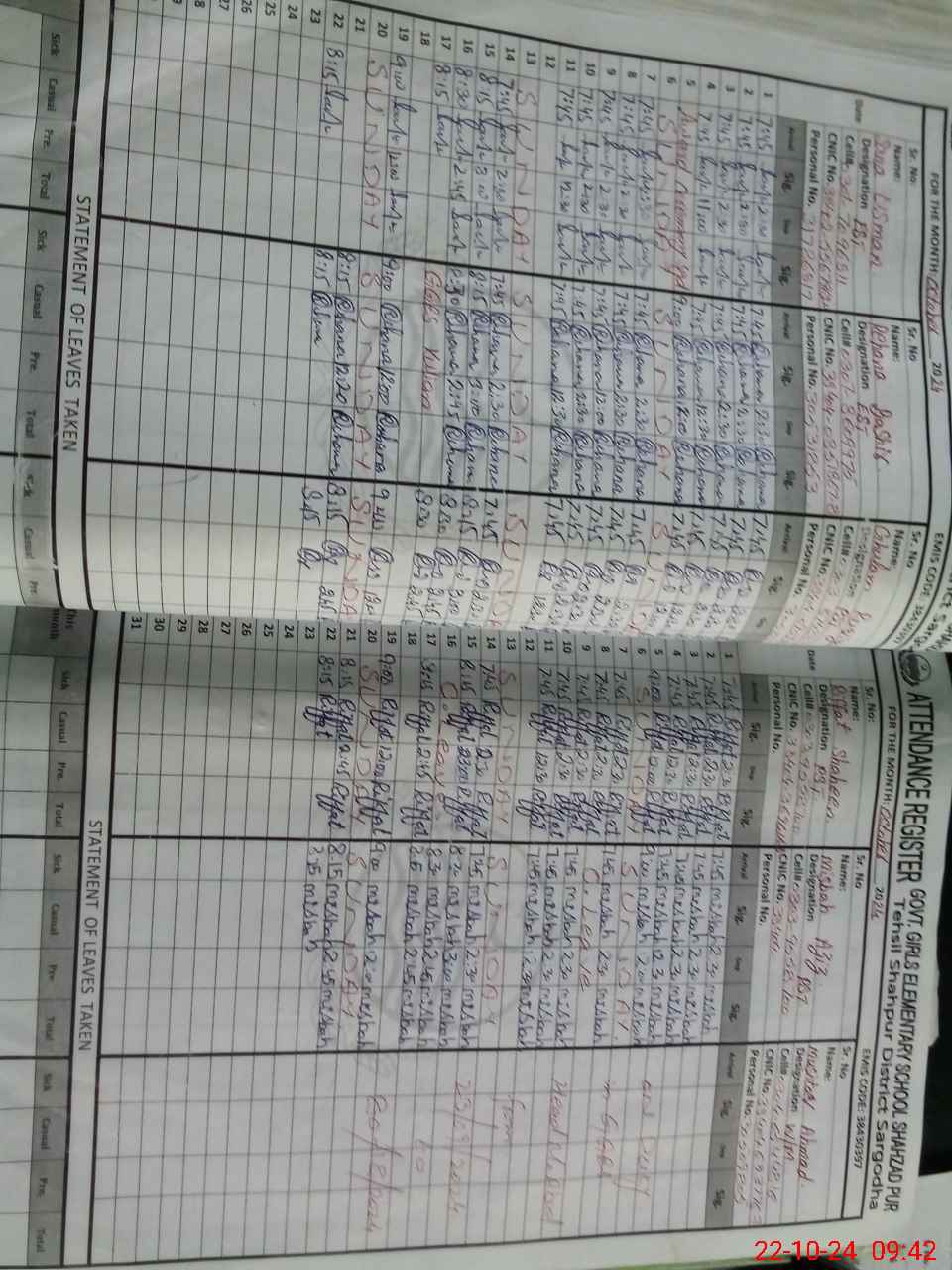 | CNIC | Full Name | Designation | R/C | Absence During Last Calender Month |