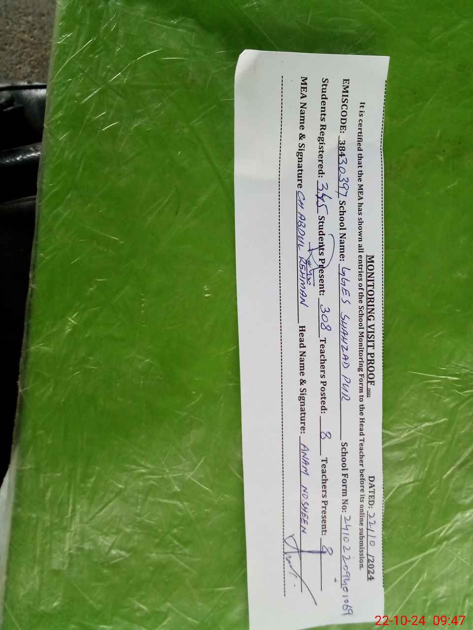 | Certified that this School was Inspected by the Undersigned MEA/DMO Today and the Information Stated Above is as Per Record. | |||||