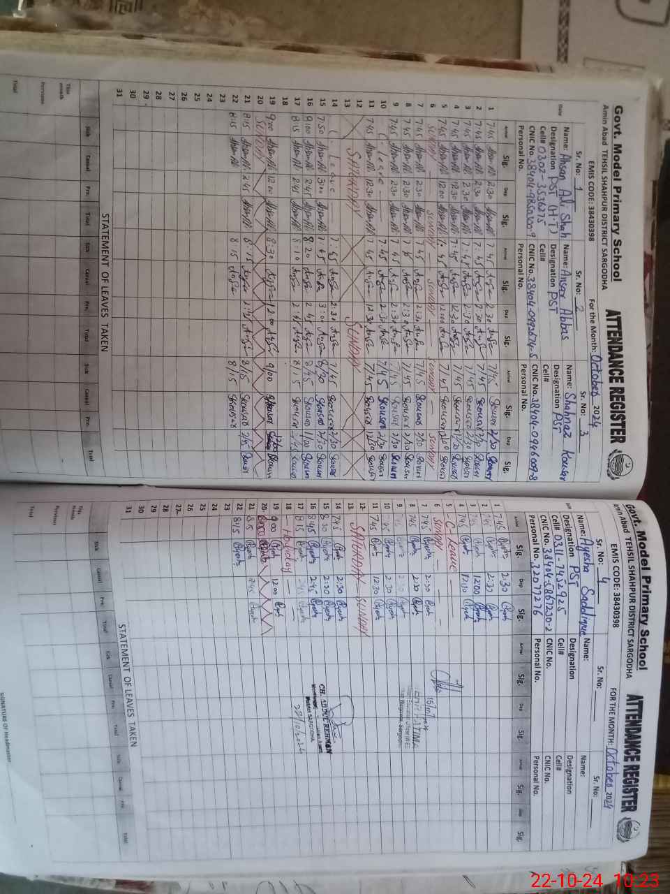 | CNIC | Full Name | Designation | R/C | Absence during last cal. month |