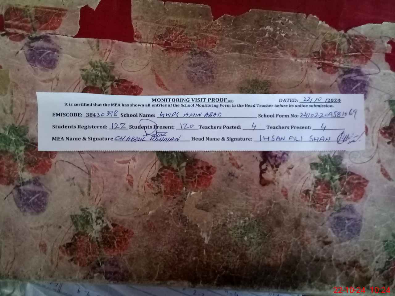 | Certified that this School was Inspected by the Undersigned MEA/DMO Today and the Information Stated Above is as Per Record. | |||||