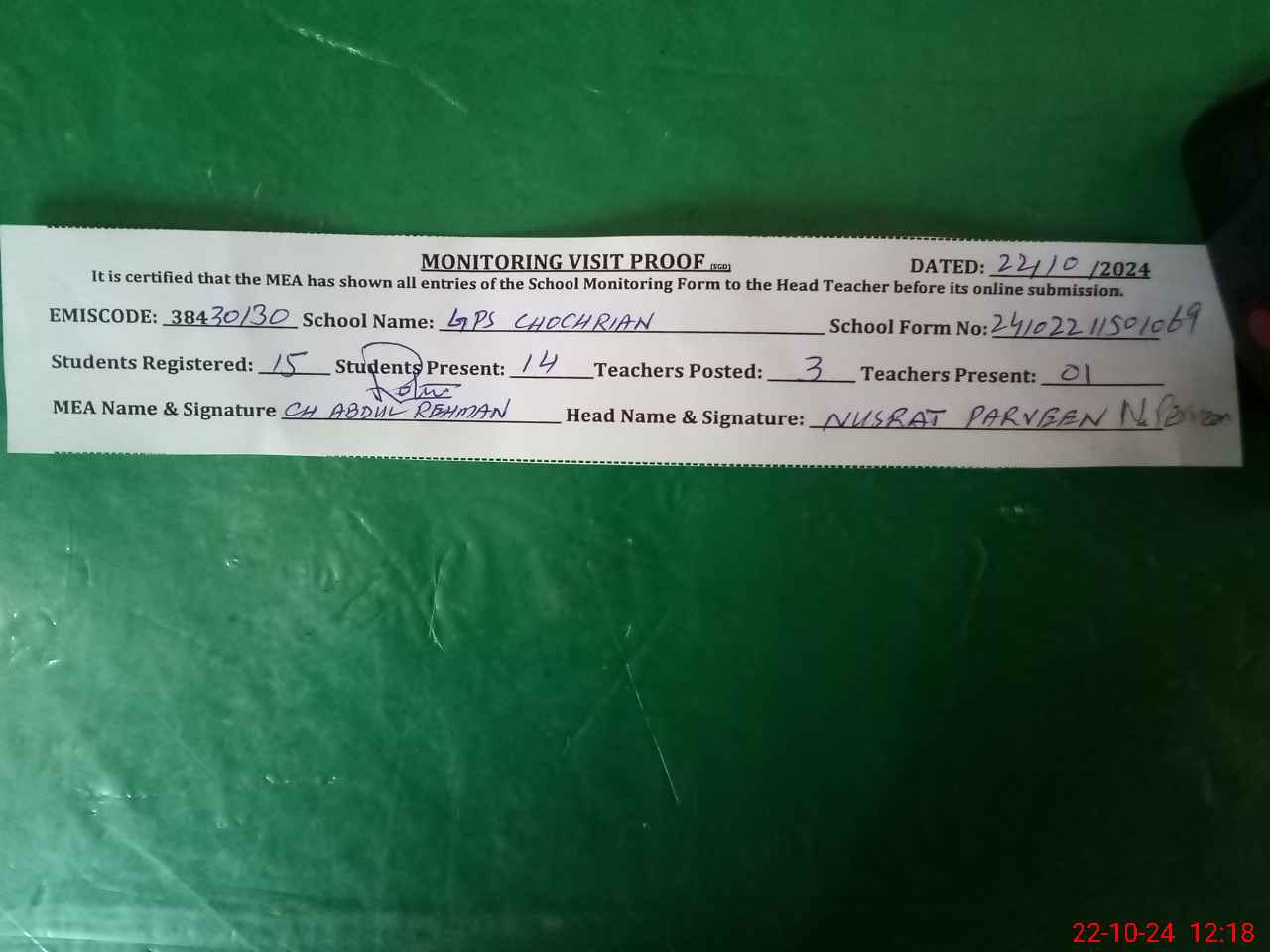 | Monitoring Date: 22-10-2024 | Start Time: 22-10-2024 11:50 AM | End Time: 22-10-2024 12:19 PM | Name of MEA: AB**** RE**** | |