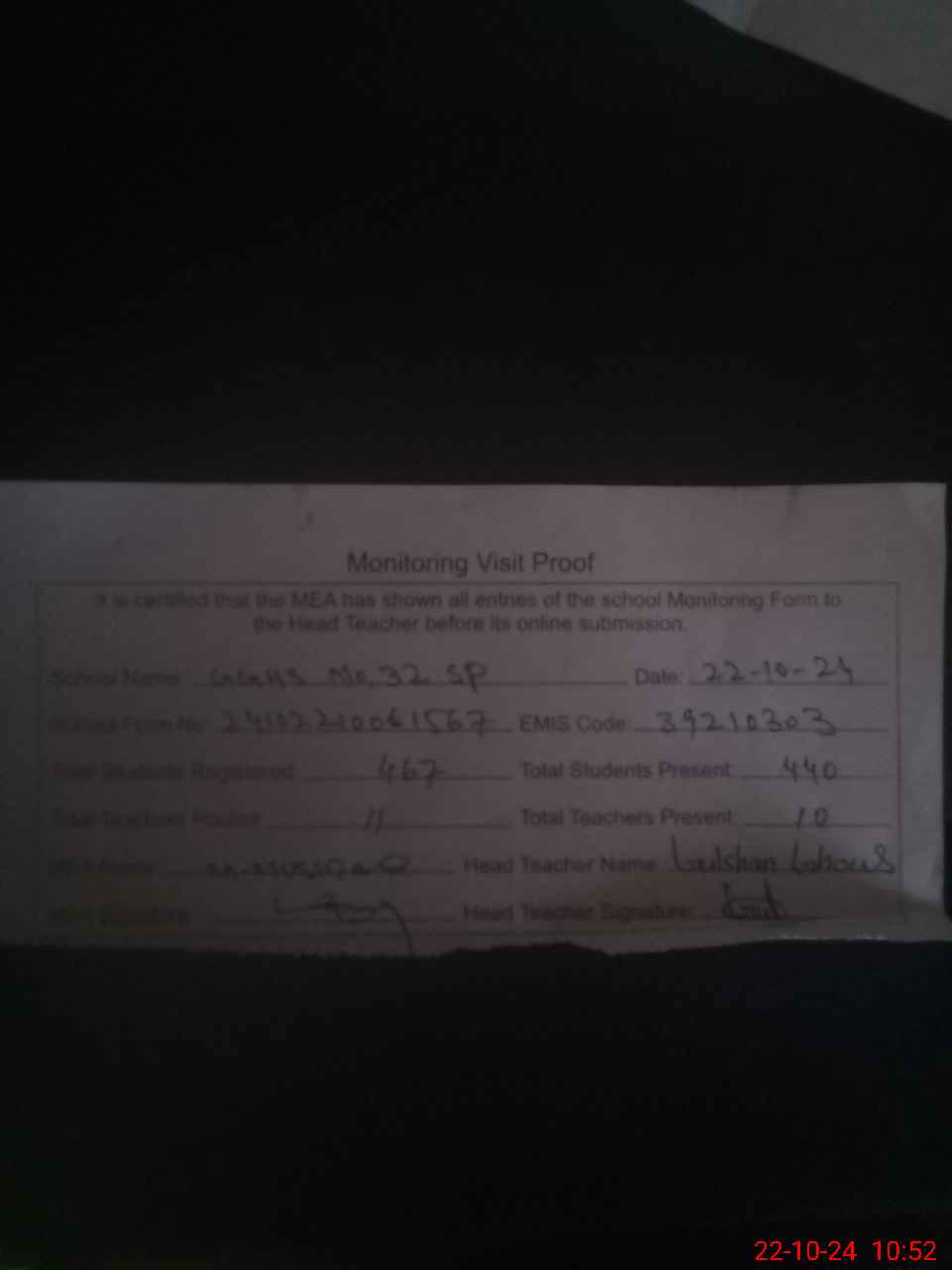 | Certified that this School was Inspected by the Undersigned MEA/DMO Today and the Information Stated Above is as Per Record. | |||||