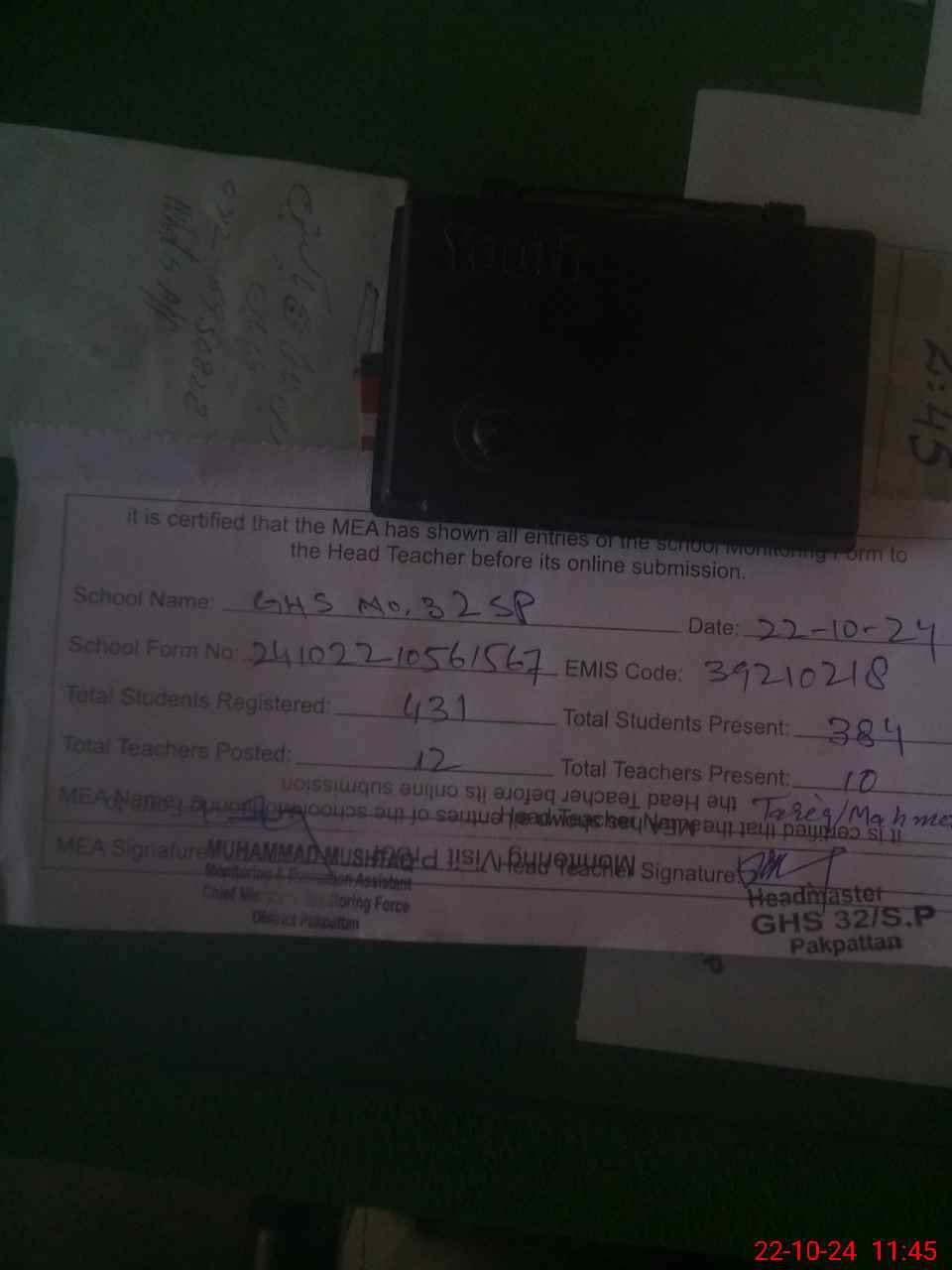 | Certified that this School was Inspected by the Undersigned MEA/DMO Today and the Information Stated Above is as Per Record. | |||||