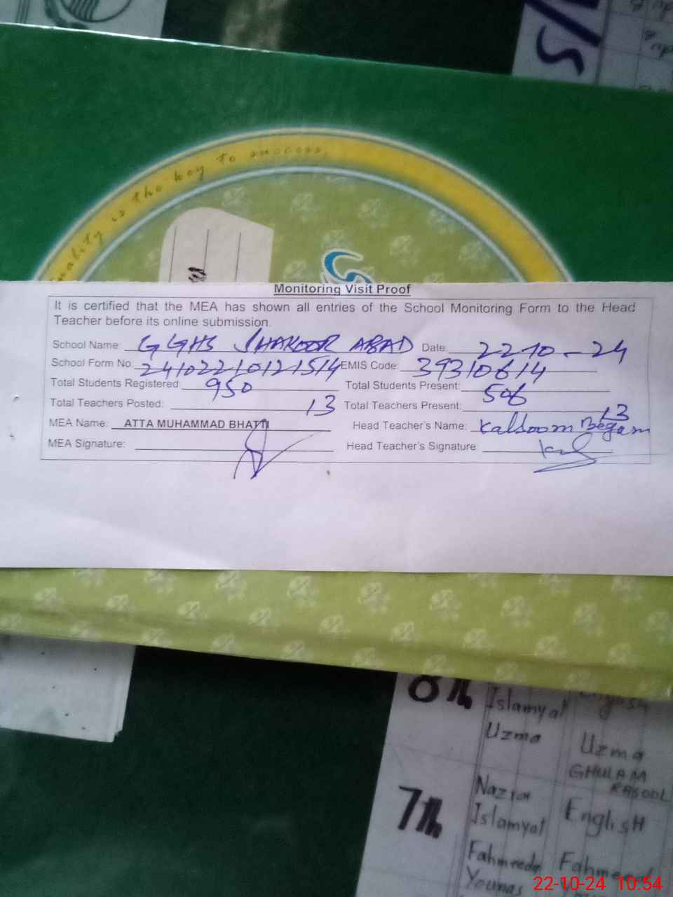| Attendance Register | Head Teacher | MEA with School | Visit Proof |