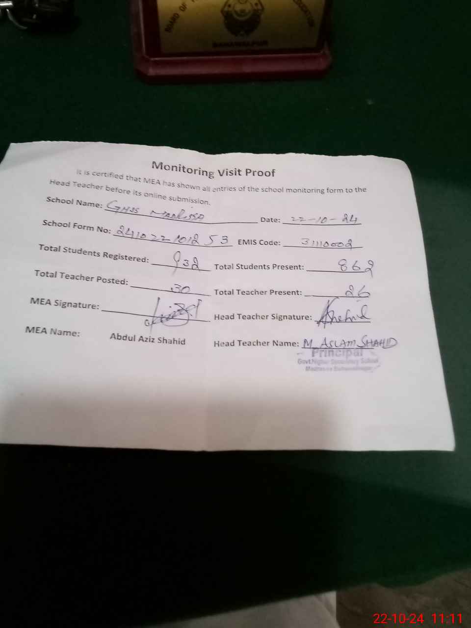 | Certified that this School was Inspected by the Undersigned MEA/DMO Today and the Information Stated Above is as Per Record. | |||||